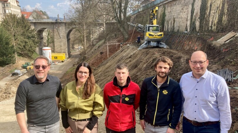 Im Stadtgraben geht es voran: Bereits seit Januar laufen die Erdarbeiten zur Neugestaltung, nun ist zusätzlich ein sogenannter Schreitbagger unterwegs. Ziel ist die Erstellung des sogenannten Rampenwegs. Die Maßnahme wird voraussichtlich bis April dauern. Mit der Ausführung ist die Spezialtiefbaufirma HTB aus Österreich beauftragt, die in Rottweil durch den Bau der Hängebrücke bereits bestens bekannt ist. Die Vergabe erfolgte dabei im Bereich Tiefbau der Stadt Rottweil.