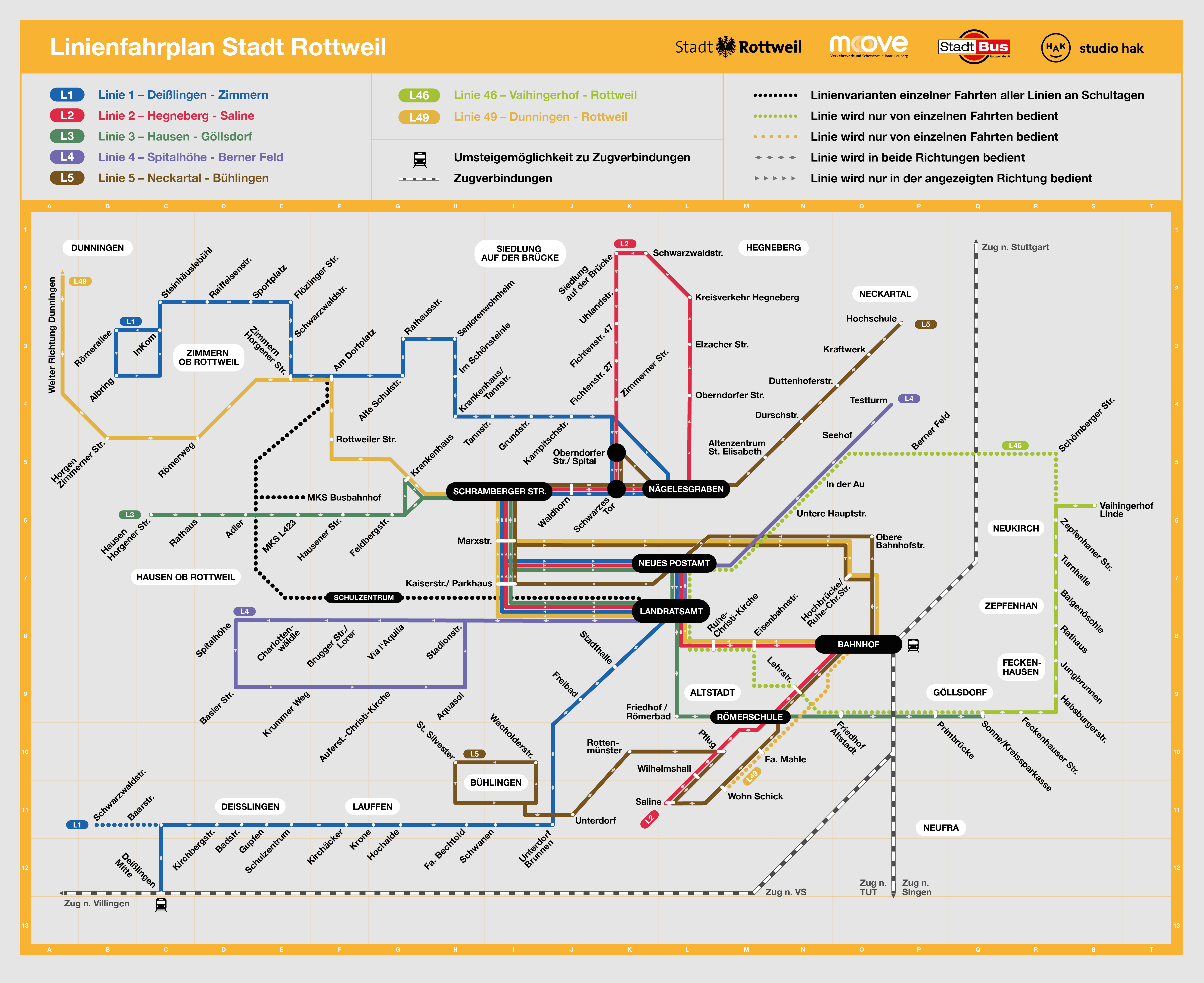 - Streckenführung: Deißlingen Mitte (mit Zuganschluss aus Bräunlingen – Donaueschingen – Villingen) über Lauffen – Rottweil nach Zimmern Steinhäuslebühl und InKom. In Rottweil erfolgt die Fahrt ab Bühlingen Unterdorf über die Stadionstr. (bisher Tuttlinger Str.) – LRA – Friedrichsplatz – Grundstr.- Tannstr.- KKH nach Zimmern.