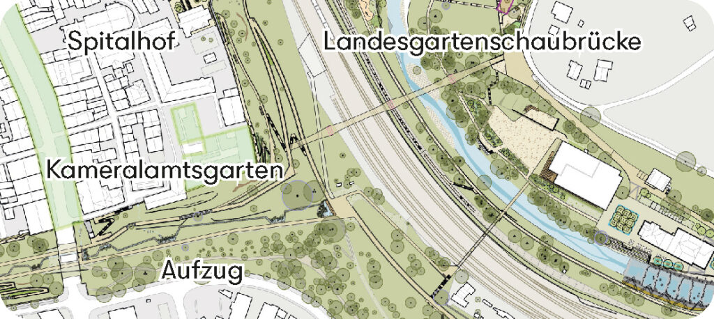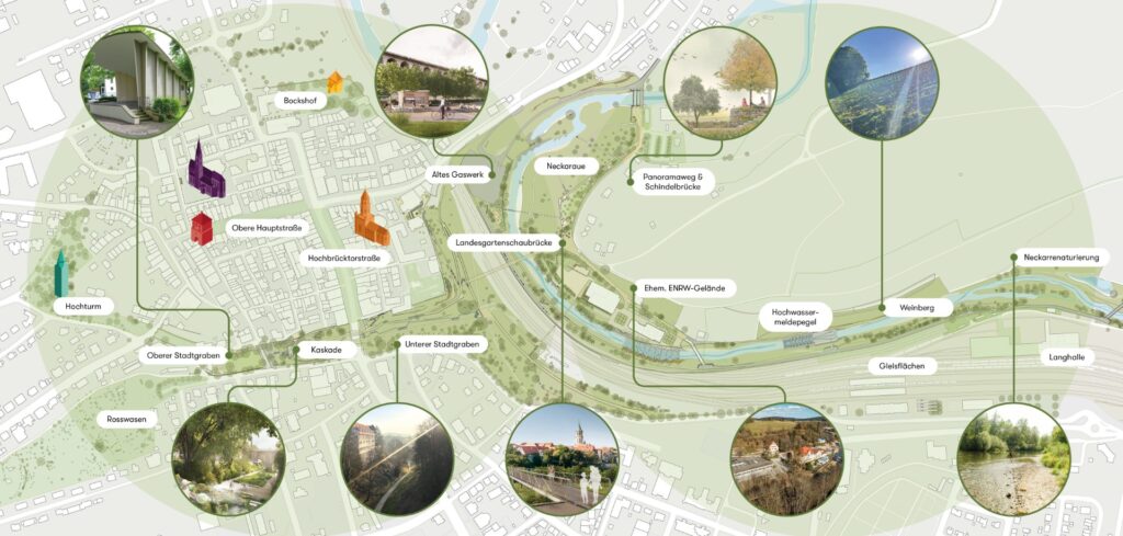 Die Verbindung vom Veranstaltungsgelände in den Neckarauen zur Innenstadt spielt eine zentrale Rolle. Die Anbindung soll Besucherinnen und Besucher ganz selbstverständlich durch die Stadt führen – etwa über den Panoramaweg, den Spitalgarten, die neue Landesgartenschaubrücke, oder durch den Aufzug an der Hochbrücke. Auch der geplante Kaskadenweg mit Wasserspiel, der vom oberen Stadtgarten in den unteren Stadtgraben führen soll, trägt dazu bei.